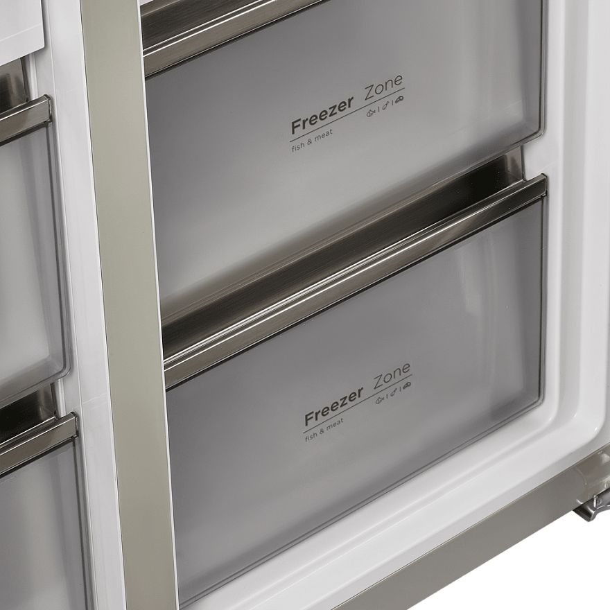 Холодильник оснащен инверторным компрессором, что обеспечивает более тихую и долговечную работу прибора. Система NoFrost в холодильном и морозильном отделениях предотвращает образование инея и льда, что значительно облегчает уход за прибором. Также в холодильнике есть функция быстрой заморозки, что позволяет сохранить полезные свойства продуктов. Управление холодильником осуществляется с помощью сенсорных переключателей и электронного дисплея. Это позволяет точно регулировать и контролировать температуру в отделениях. Звуковая индикация открытой двери и световая сигнализация о повышении температуры в морозильном отделении помогут избежать нежелательного прогрева продуктов. Для безопасности детей предусмотрена блокировка от случайного нажатия.