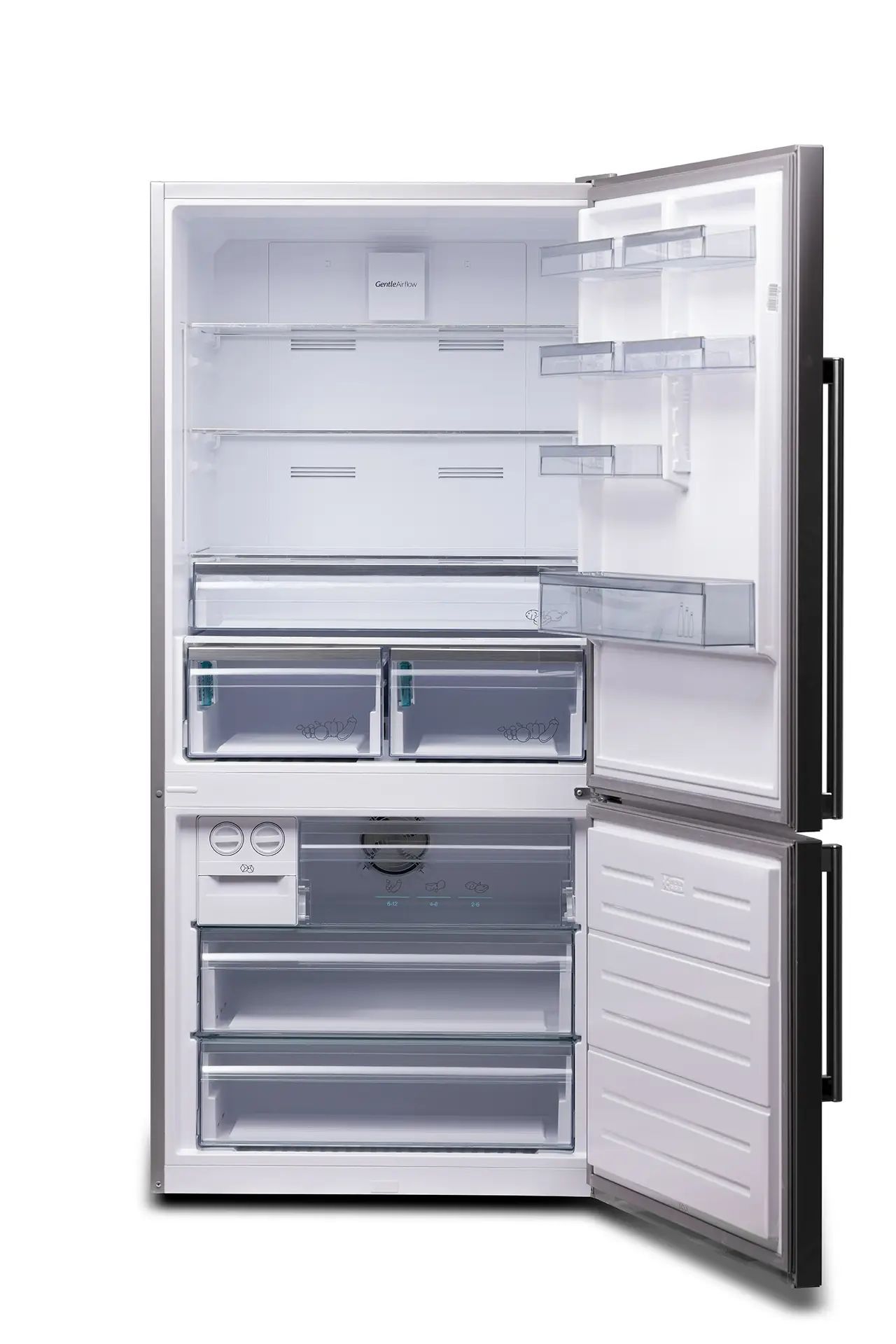 Внушительный полезный объём 564 л при оптимальных внешних габаритах. Нижняя морозильная камера. Технология охлаждения нового поколения Gentle AirFlow, позволяющая равномерно и правильно охлаждать и замораживать продукты без образования инея и льда. Высокий класс энергоэффективности A++. Максимально удобное электронное управление с индикацией всех режимов на большом LCD-дисплее.