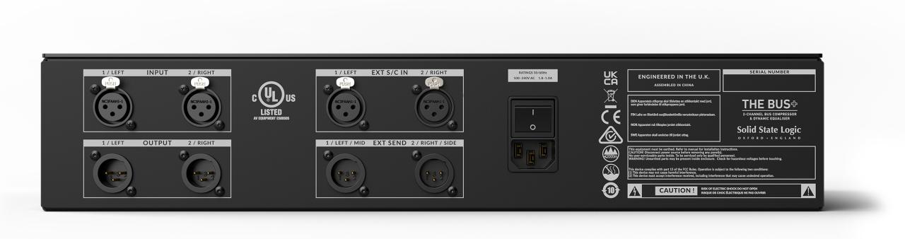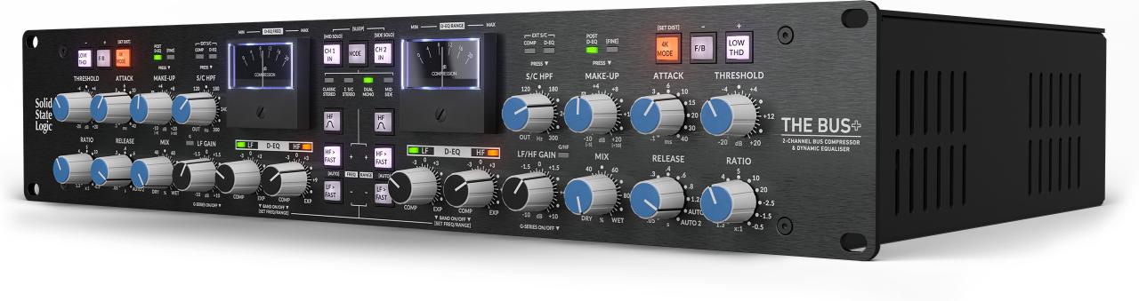 Solid State Logic SSL THE BUS+ – аппаратный двухканальный компрессор, который является переизданием модели G-Series Bus Compressor с обновлённой схемой динамической обработки. Устройство поставляется в рэковом 2U размере и модернизирует оригинальную схему с помощью современных компонентов, предлагая актуальные функции. Девайс обзавёлся таким параметром как сайдчейн и режимом работы Turbo для более мощной компрессии. Помимо прочего, компрессор может работать в четырёх режимах включая Dual Mono, Classic Stereo, S/C Stereo и Mid-Side. Также имеется три настройки окрашивающей компрессии: F/B, LOW THD, 4K MODE. Кроме того, компрессор оснащается ступенчатыми потенциометрами, двухполосным параллельным динамическим эквалайзером с режимами compression / expansion modes, поддержкой отрицательных соотношений компрессии и прочими функциями. Коммутационные возможности компрессора представляют из себя выход L/R XLR, вход L/R XLR, вход L/R EXT S/C IN (для сайдчейна) и разъём L/R EXT SEND для дублирования входного сигнала, например, подачи внешнего эквалайзера, возвращающего обработанный сигнал на EXT S/C IN или для доступа к Mid/Side.
