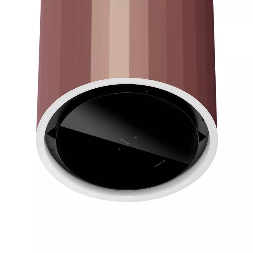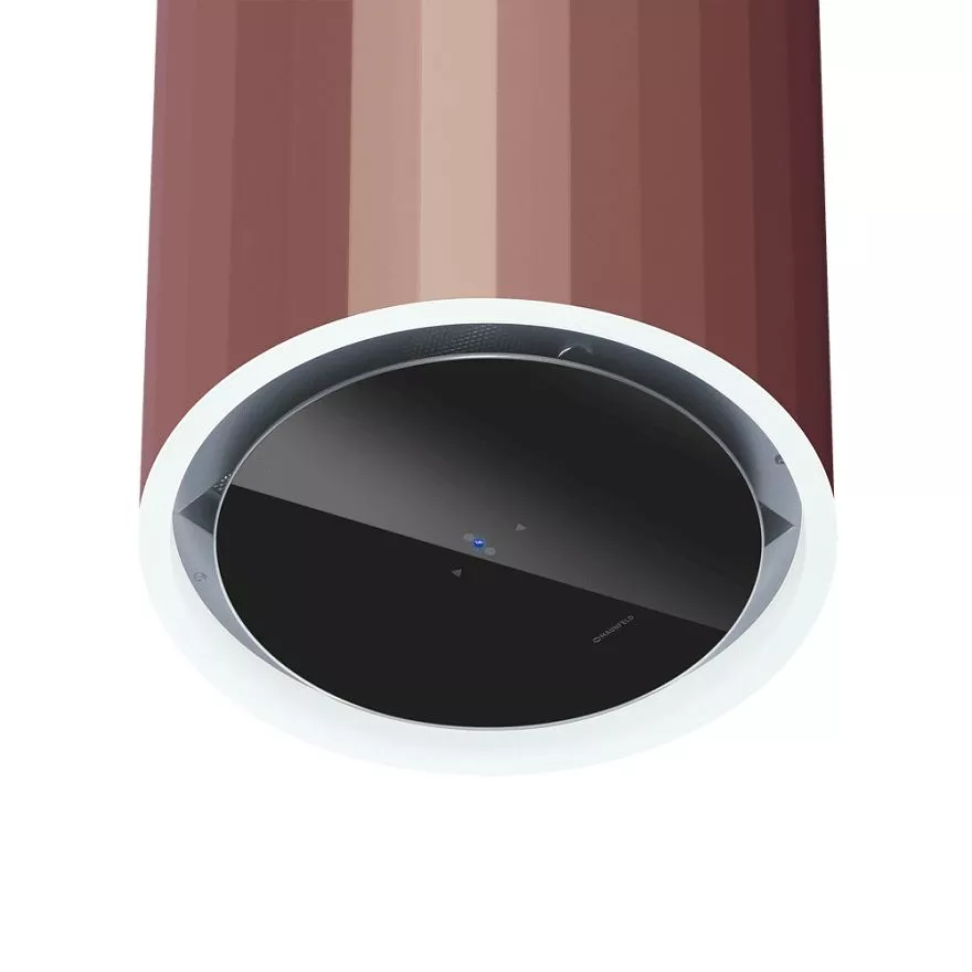 Дизайн вытяжки эффектно выделяется рельефными полосами вдоль цилиндрического корпуса и запоминающейся стеклянной панелью, выполненной в соответствии со всеми тенденциями рынка бытовой техники.