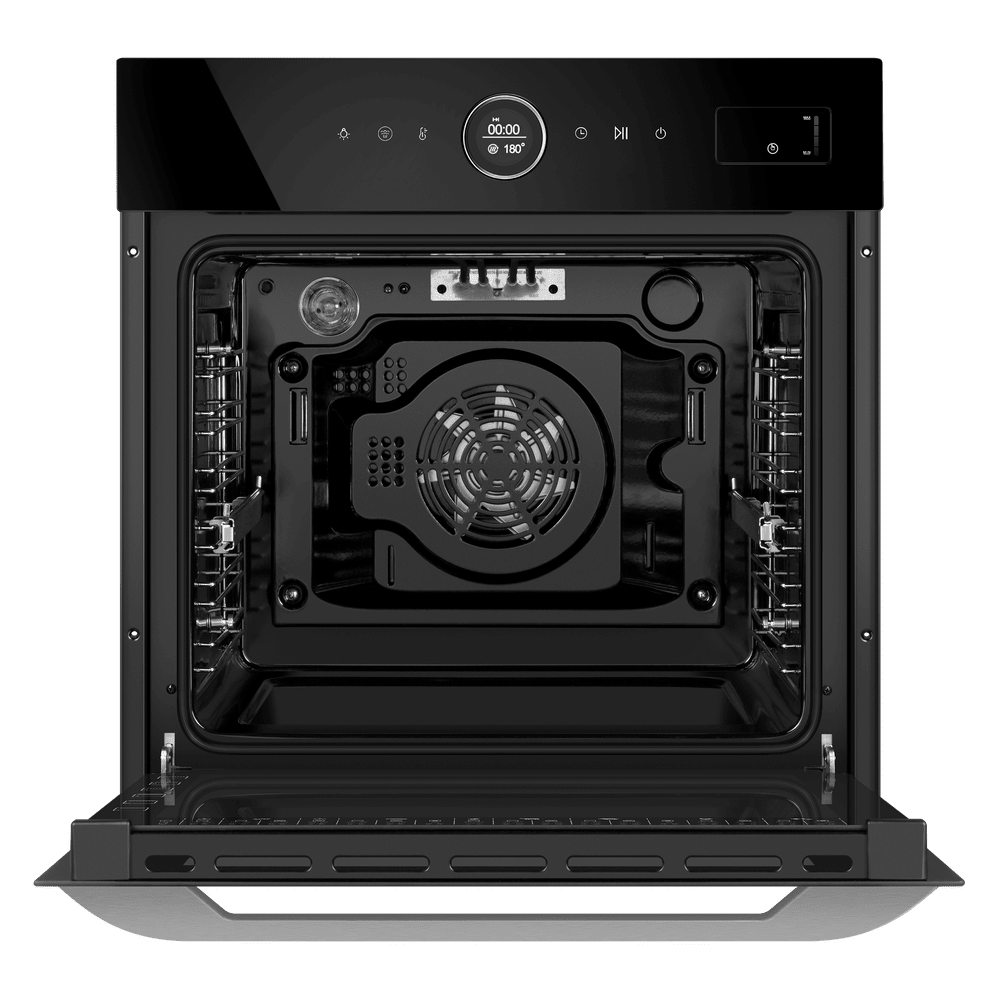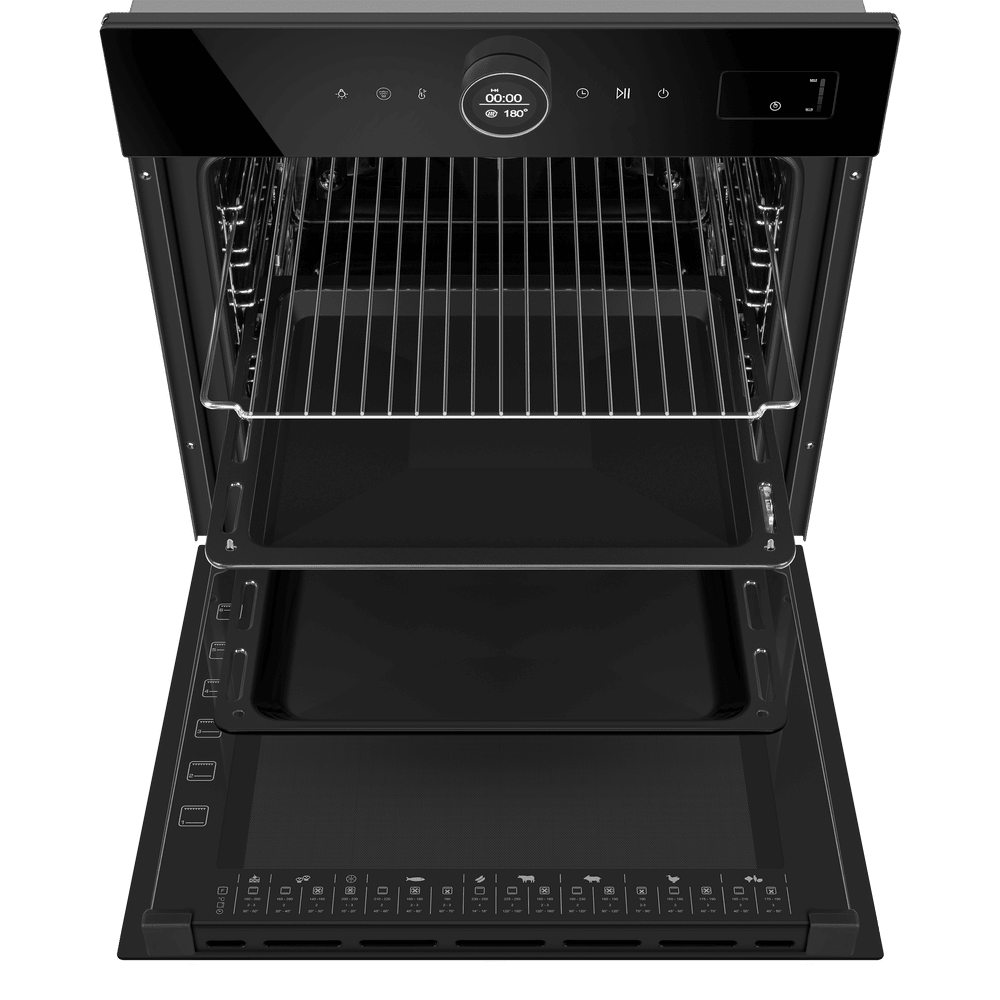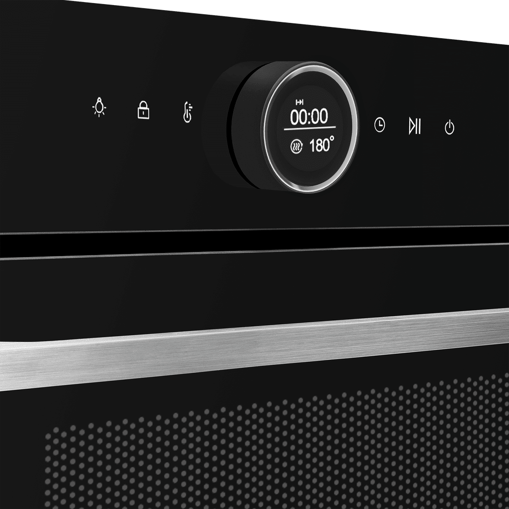 Интуитивное сенсорное управление с дисплеем делает настройку параметров максимально простой: касание — и нужный режим активирован. Тройное стекло дверцы и «холодный фронт» повышают безопасность, снижая нагрев внешнего стекла при работе духовки.