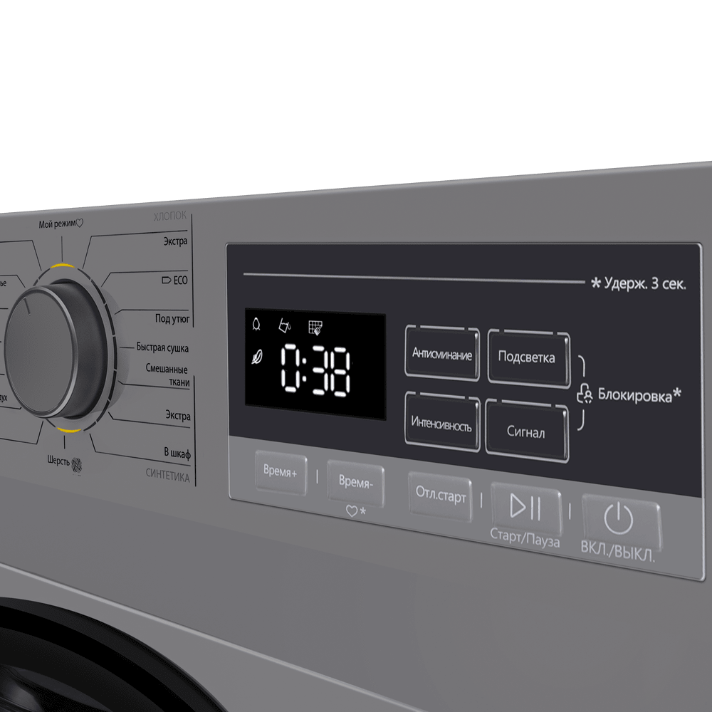 Загрузка до 8 кг и внушительный объём барабана дают возможность сушить большие партии белья за один раз. Режим «Антисмятие» предотвращает образование складок, а внутренняя подсветка упрощает загрузку и выгрузку вещей.