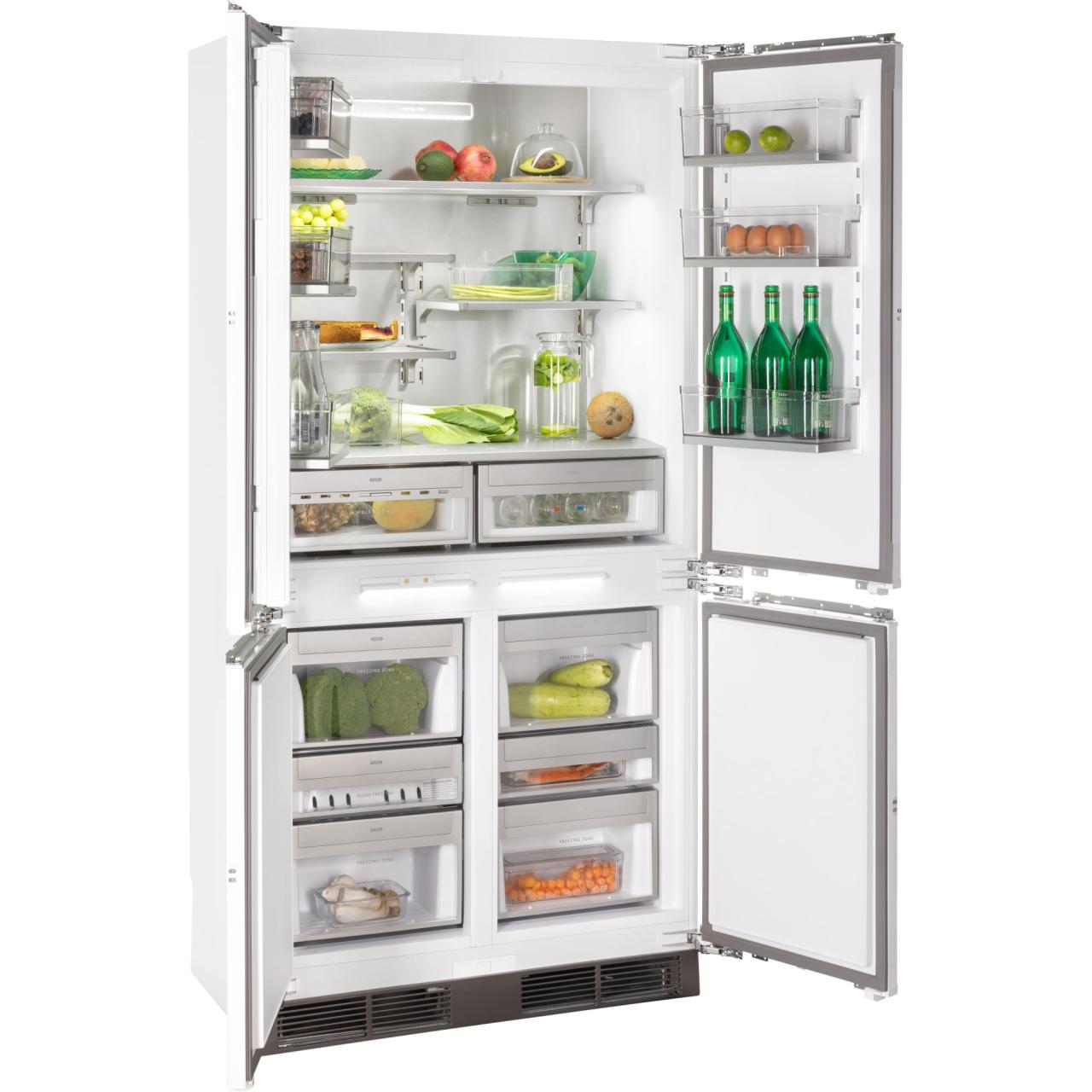 Благодаря четырехдверной конструкции и открыванию дверь в дверь пользователь получает доступ к продуктам, не выпуская при этом холод из остальной части холодильника. Модель имеет жесткую систему крепления фасадов: они не связаны с корпусом шкафа, не предполагают наличие дополнительных петель. Холодильник имеет неограниченный угол открывания, отсутствуют зазоры, в которых могут скапливаться загрязнения.