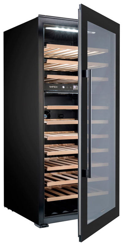 Данная модель винного шкафа оборудована вентиляторами, которые обеспечивают в нем циркуляцию воздуха, поддерживая постоянную и стабильную температуру. Конденсат используется повторно и поддерживает в приборе оптимальную влажность, а активный угольный фильтр обеспечивает свежий и чистый воздух.